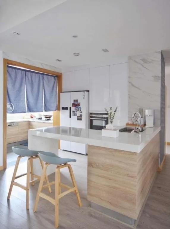 這是最靈活也是最常見的中西分廚的形式,適用于大多數的家庭。 可以因地制宜地將西廚房設置在客廳、餐廳甚至是吧臺,只要是其他有空余位置的就可以。