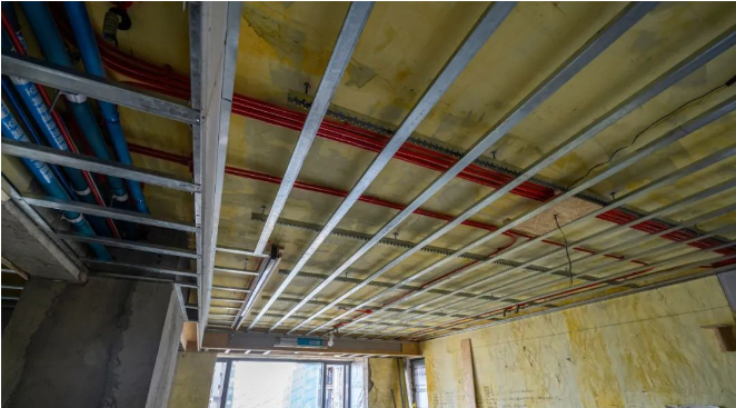 6、吊頂整體的施工流程為:放線→打孔→安裝吊桿→安裝龍骨→制作窗簾盒→制作風(fēng)口→龍骨隱蔽驗(yàn)收→安裝石膏板。