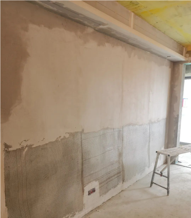 5、厚找平結(jié)束后,掛網(wǎng)格布,提升墻面穩(wěn)定性。