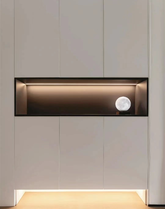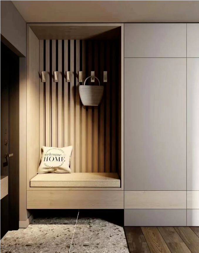 我們的入戶空間如果是做定制玄關柜,別忘了在底部預留10cm-30cm的懸空空間。這樣設計方便進出時放置一些常用的鞋子,節省時間還能讓空間更整潔。