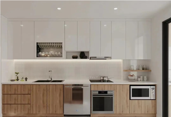 按照我們做菜的習慣來設計,可以參考:冰箱(取出)——水池(清洗)——備案臺(切)——灶臺(炒)——臺面(盛)。簡稱“備->洗->切->炒”四點,將廚房分為:水槽區、切菜區、炒菜區,一條流水線排列。