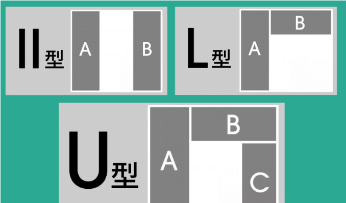 考慮到面積問題,廚房的布局還分為4種,一字型、L型、U型、島臺布局