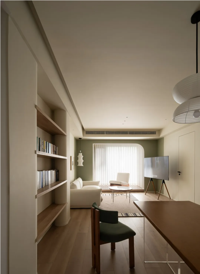 一間臥室,改變動(dòng)線后,設(shè)計(jì)為集辦公、儲(chǔ)物、閱讀、茶室、臨時(shí)客房一體的多功能空間。