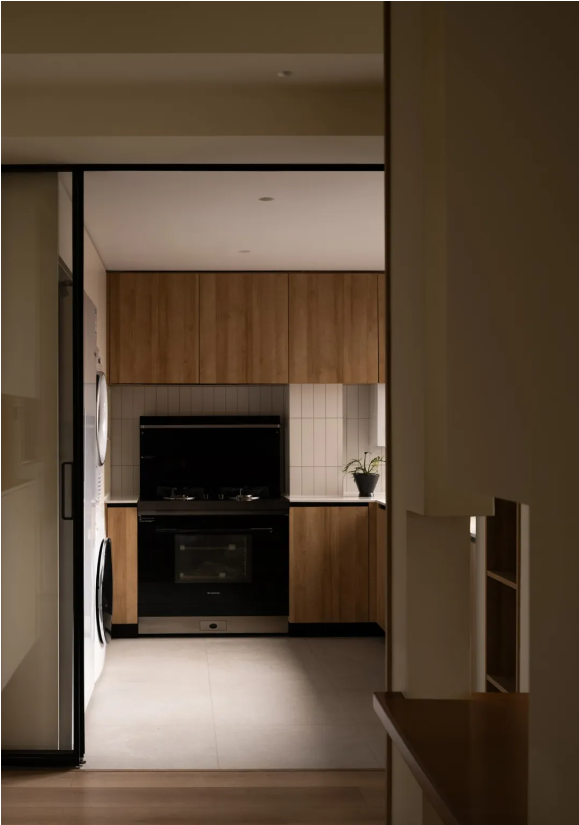 將生活陽(yáng)臺(tái)納入廚房擴(kuò)大使用面積,功能齊全,儲(chǔ)物空間充足,而且采光也得到了改善。