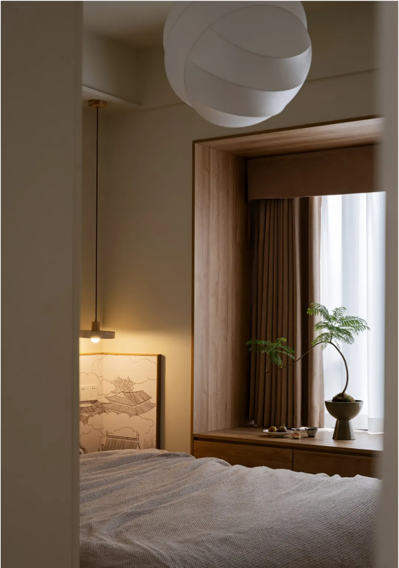 臥室延續(xù)外部素雅色調(diào),局部融入飽含東方美學(xué)意境的墻頭插畫(huà),給予足夠優(yōu)雅、舒適的睡眠氛圍。