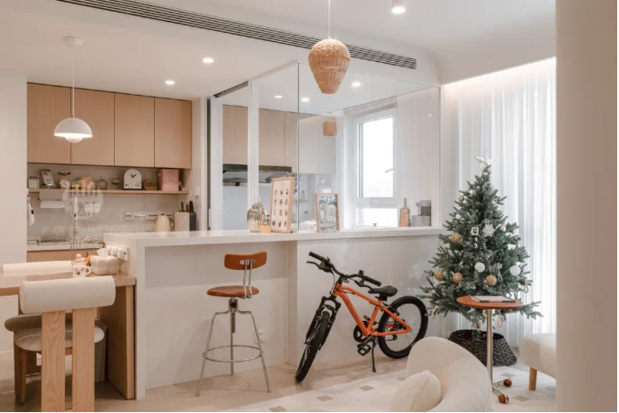 客餐廚三區(qū)無縫銜接,開放式布局讓空間感倍增,小戶型也能享受大宅的開闊視野。溫暖的奶油色調(diào)搭配柔和燈光,營(yíng)造出溫馨舒適的居家氛圍。