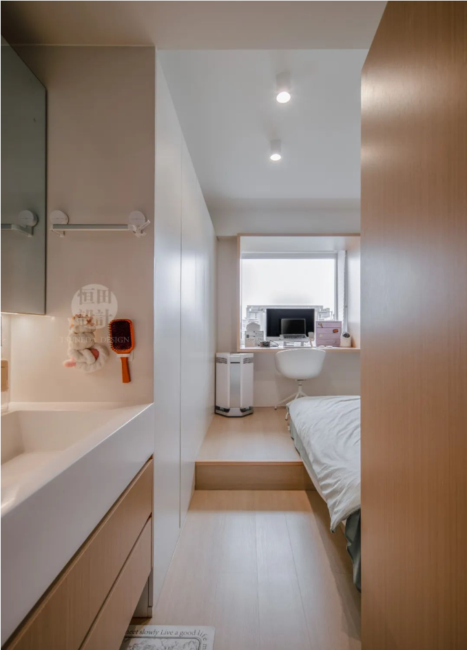 在這2.3m3的立面空間里,收納超乎想象。上方床、下方衣帽間、轉(zhuǎn)角處儲(chǔ)物抽屜,再加開放格書柜!嘎槿鸽m小,可五臟俱全」,落為現(xiàn)實(shí)。
