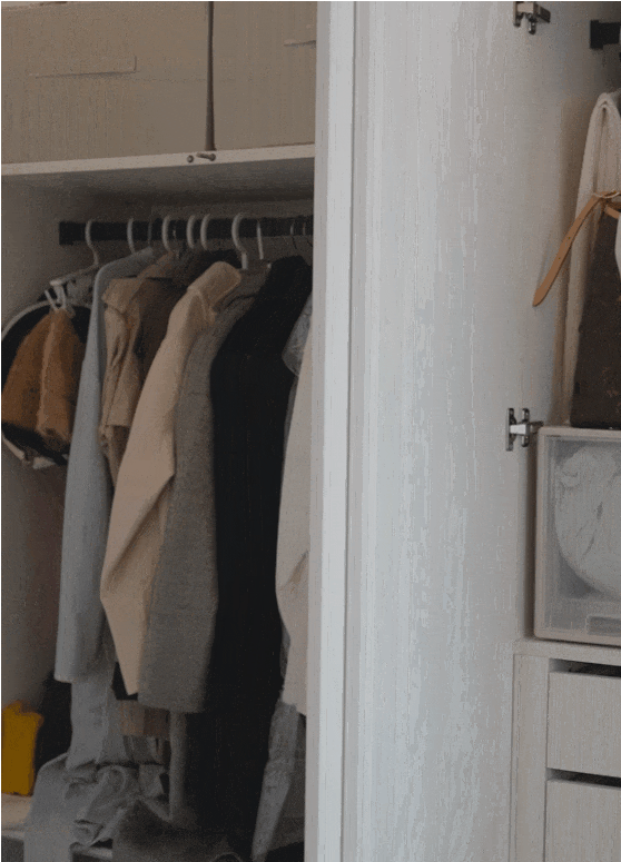 入戶處,沿墻精心打造了一條5.5米長(zhǎng)的超薄鞋柜,巧妙劃分玄關(guān)落塵區(qū),專為鞋履與次凈衣物設(shè)計(jì)。柜內(nèi)層板高度可自由調(diào)節(jié),提升了儲(chǔ)物的靈活性與便利性。