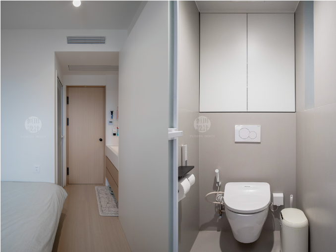 小主臥也能有獨(dú)立衛(wèi)生間。洗漱區(qū)外置,滿足日常洗漱。恭桶區(qū)內(nèi)采用油砂玻璃,盡可能借助自然采光。馬桶后留15cm薄柜,放些日用品最合適不過了。