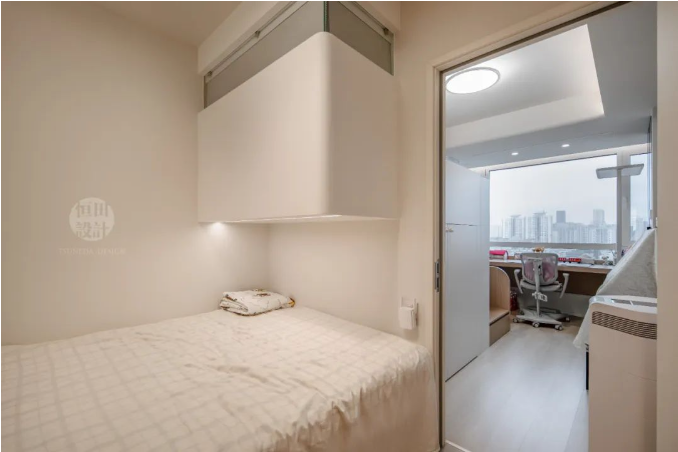 孩子現(xiàn)在喜歡和奶奶待在一起,所以就把原主臥拆成兒童房和長(zhǎng)輩房?臻g不夠放兩張2m的床,就將立面空間利用到位,保證睡覺時(shí)兩條腿都能伸直。