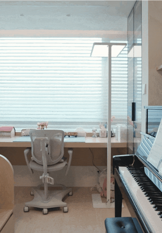 順著老人房,來到兒童房。靠窗的3m大長(zhǎng)桌,家長(zhǎng)可以坐在旁邊輔導(dǎo)作業(yè)。上方內(nèi)置隱藏晾衣架,孩子白天上學(xué)時(shí),趁機(jī)晾晾衣物。